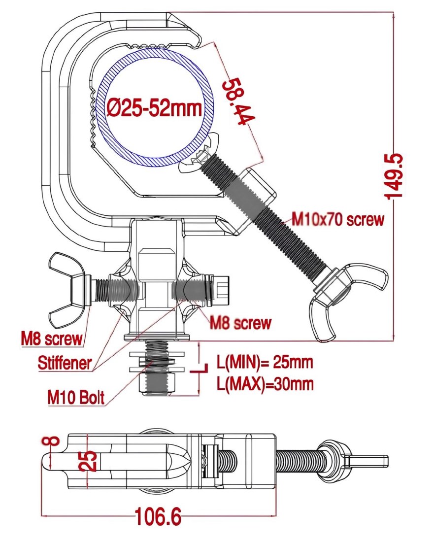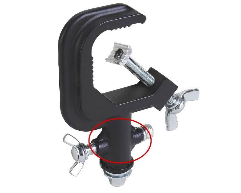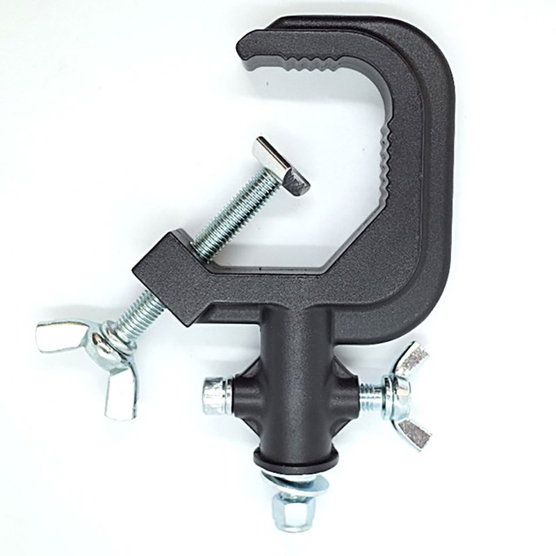 Струбцина С типа с удобным механизмом с быстрой фиксацией позволяет быстро и надежно крепить световые приборы и другое оборудование к сценическим фермам или трубам диаметром от 25 до 52 мм. Способна выдерживать нагрузки до 200 кг. Цвет чёрный.